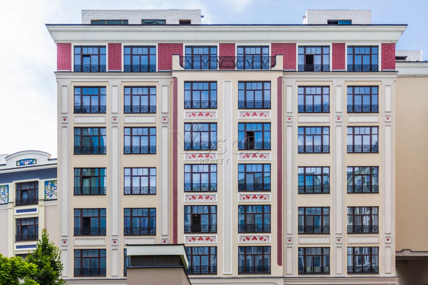 Окна ориентированы в сторону Мерзляковского переулка на зеленые кроны деревьев.